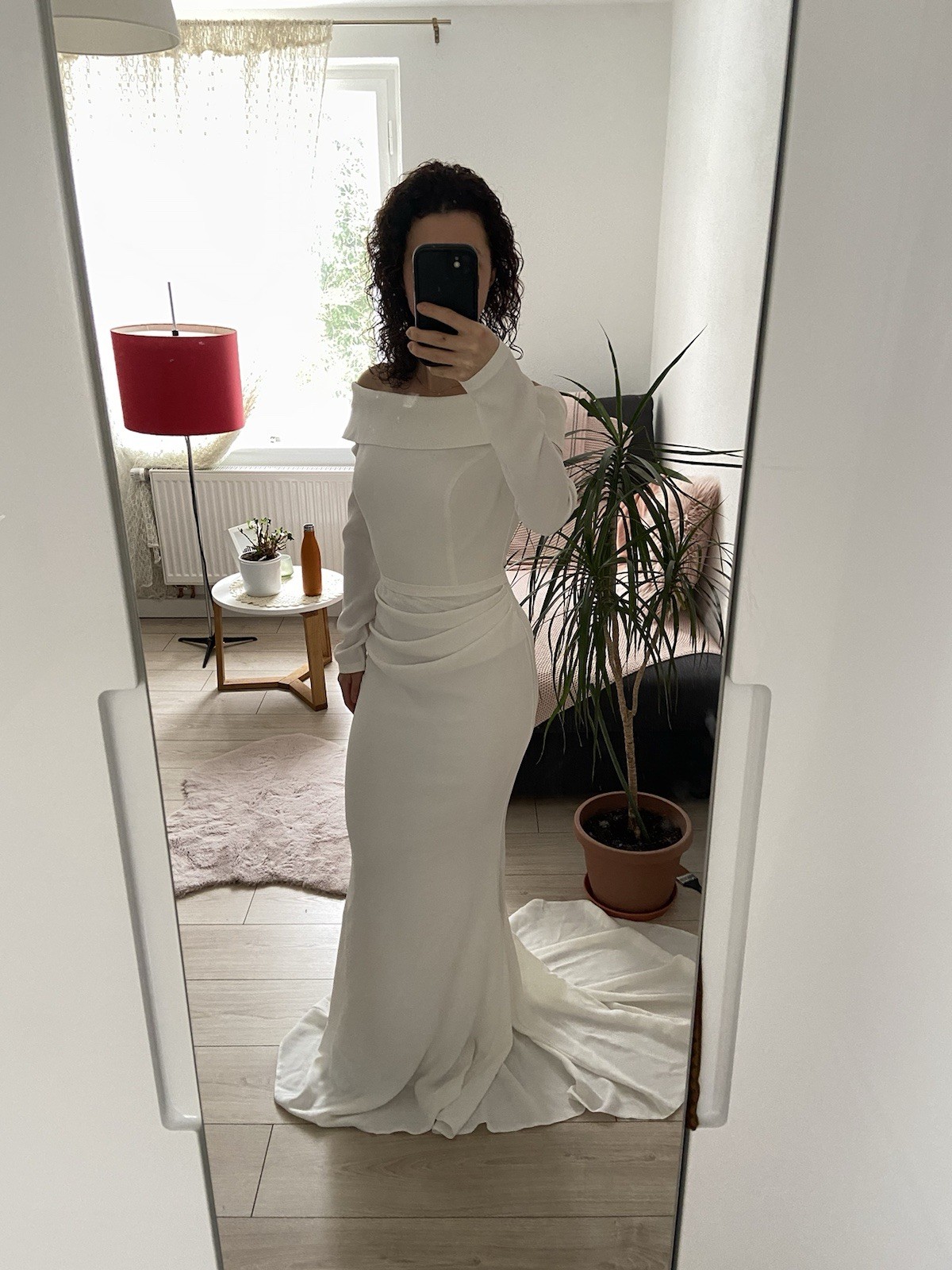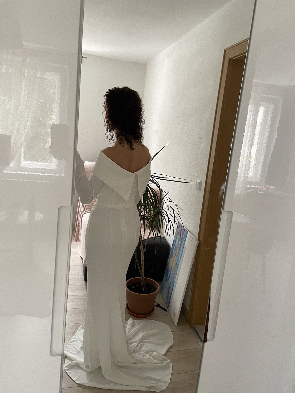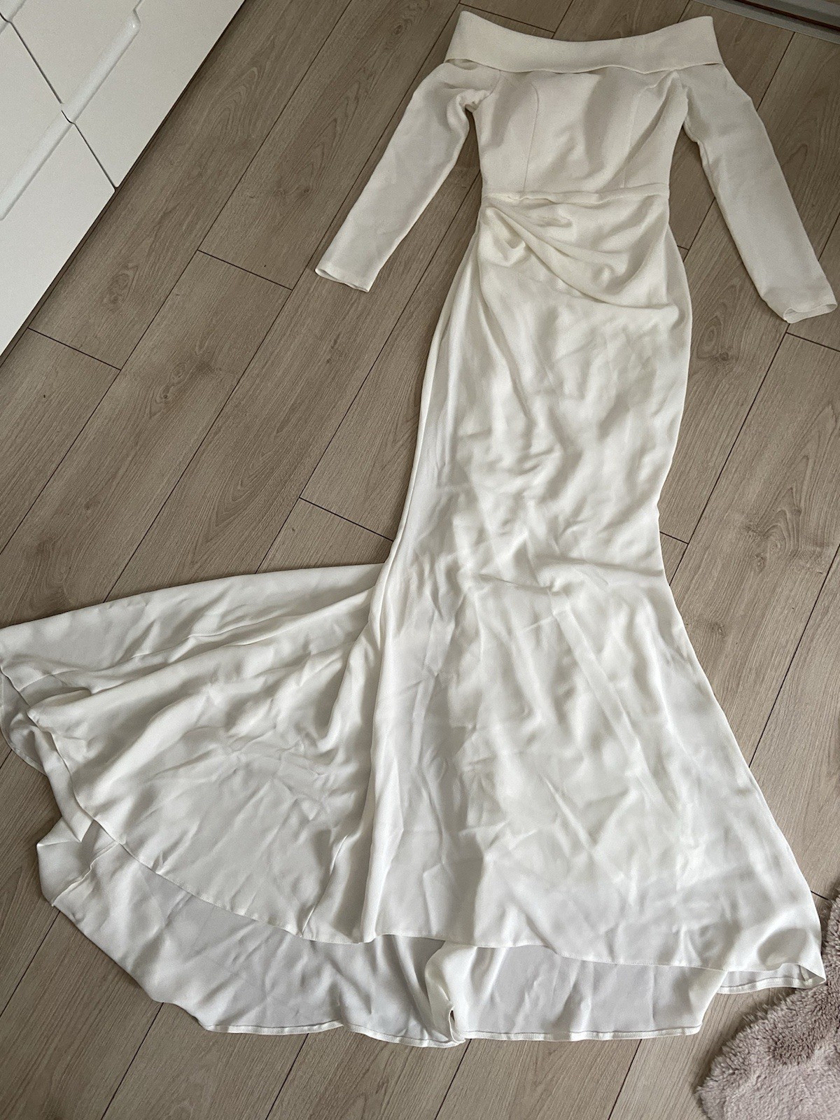 Wunderschönes Brautkleid, neu (nie getragen). Leicht stretchiger, fester Stoff mit Futter. Figurbetonte A-/leichte Meerjungfrauen-Silhouette mit dezentem längeren Schleppe hinten. Eleganter Boot-Ausschnitt, am Rücken besonders schön. Mit eingearbeitetem Brustfutter. Maße: Brust: 84–86 cm Taille: 65–67 cm Hüfte: 94–96 cm Neupreis: 370 €