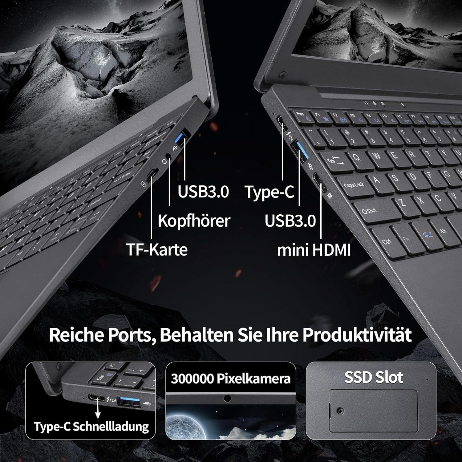 2× USB 3.0, Mini HDMI, 3,5 mm Kopfhöreranschluss, TF-Kartensteckp, USB Typ-C (Laden), microSD-Slot