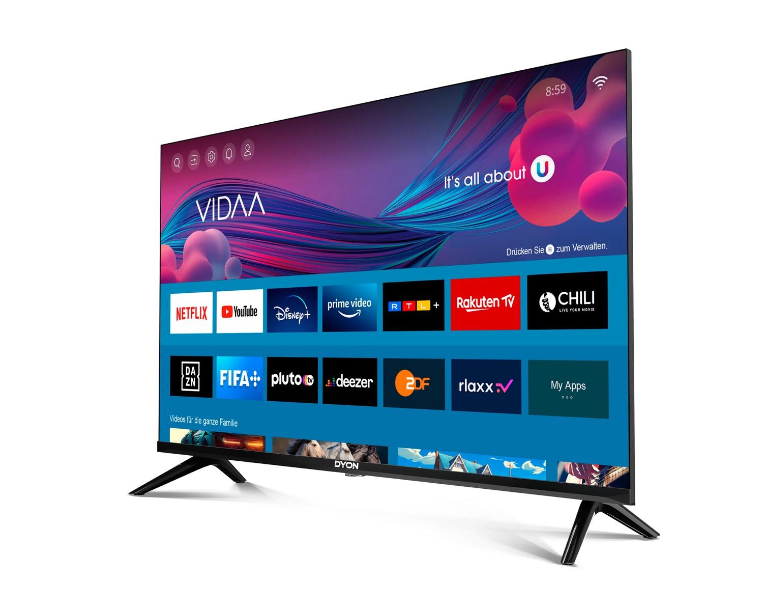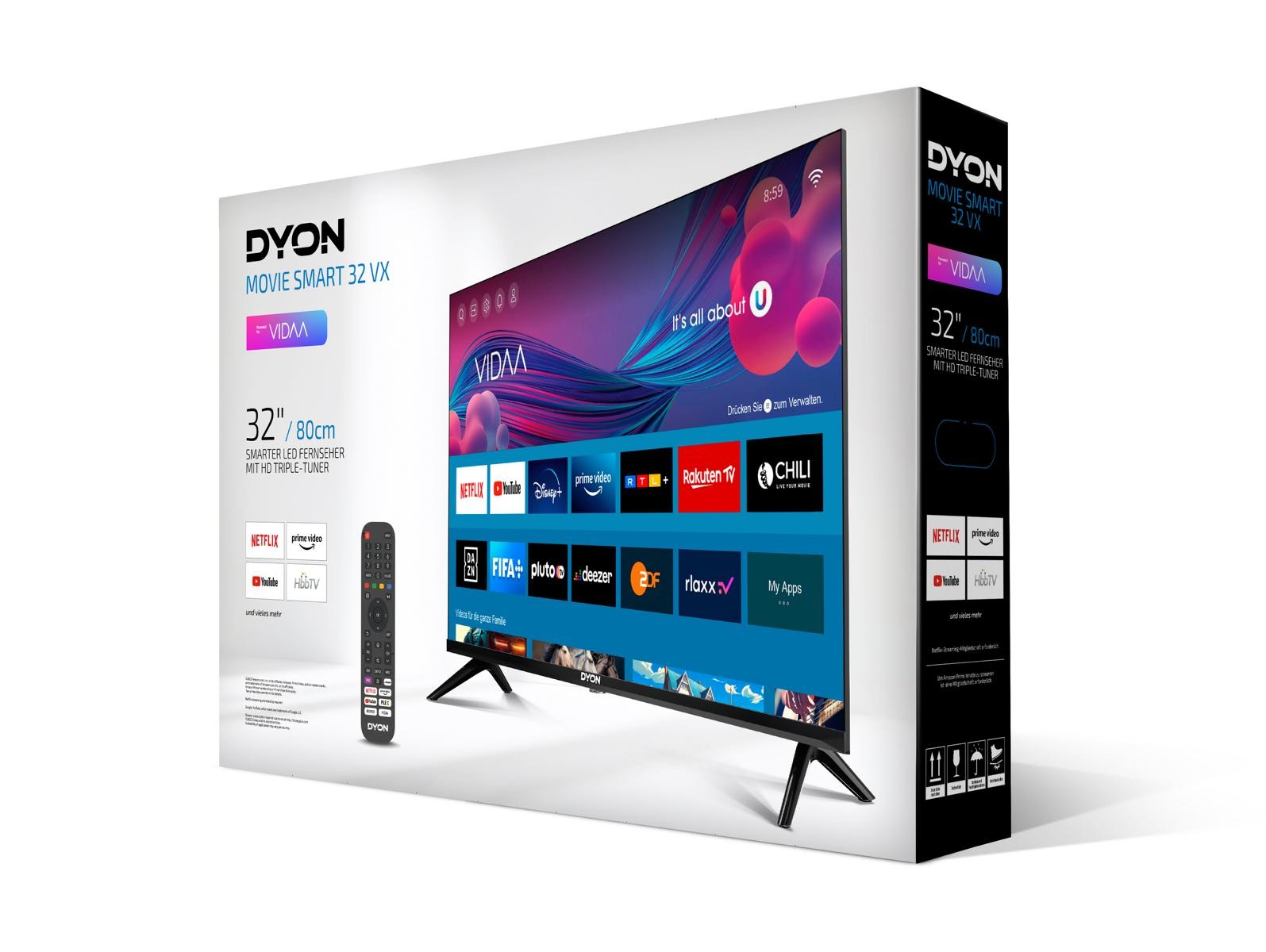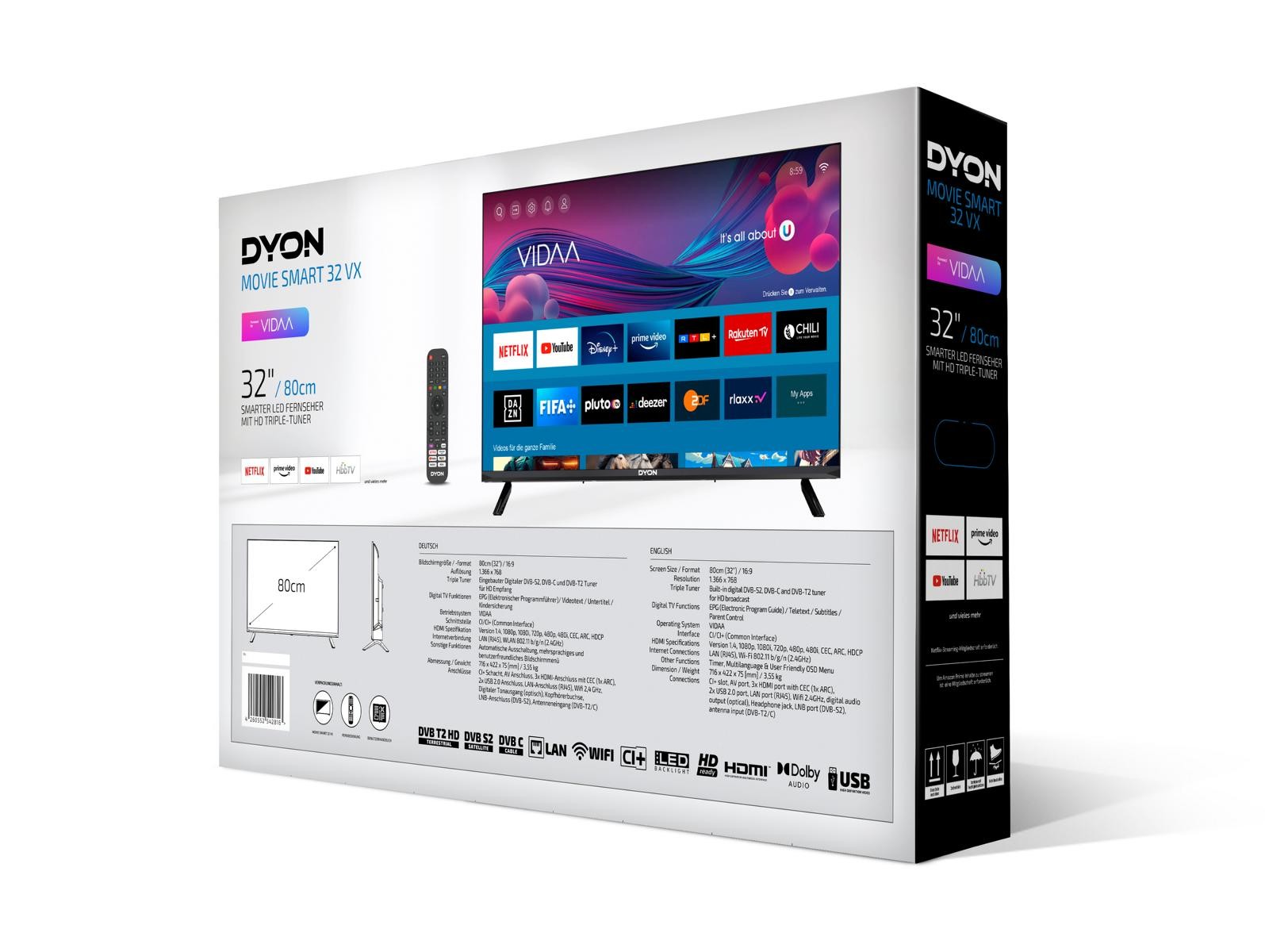 Besonderheiten: Flachbildschirm. Marke: Dyon. Modell: DYON Movie Smart 32 VX. Smarte Unterhaltung bekommt eine Plattform. Die neue Movie Smart VX Serie von DYON verfügt über das neue und intuitive VIDAA Betriebssystem, welches keine Grenzen setzt.
